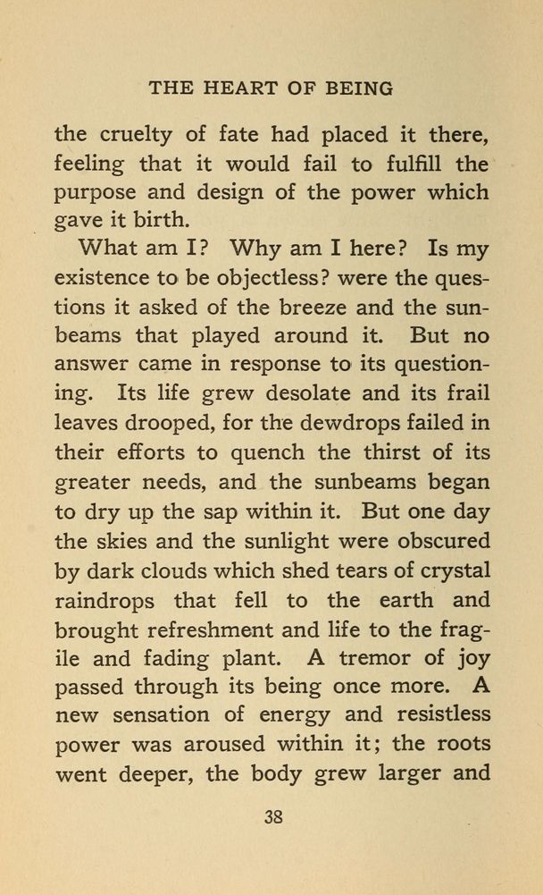 What am I? Why am I here? Is my existence to be objectless? were the questions it asked of the breeze and the sunbeams that played around it. But no answer came in response to its questioning. Its life grew desolate and its frail leaves drooped, for the dewdrops failed in their efforts to quench the thirst of its greater needs, and the sunbeams began to dry up the sap within it. But one day the skies and the sunlight were obscured by dark clouds which shed tears of crystal raindrops that fell to the earth and brought refreshment and life to the fragile and fading plant. A tremor of joy passed through its being once more. A new sensation of energy and resistless power was aroused within it; the roots went deeper, the body grew larger and