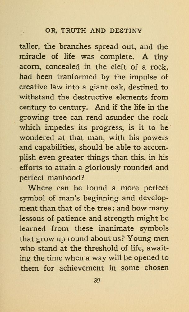 taller, the branches spread out, and the miracle of life was complete. A tiny acorn, concealed in the cleft of a rock, had been transformed by the impulse of creative law into a giant oak, destined to withstand the destructive elements from century to century. And if the life in the growing tree can rend asunder the rock which impedes its progress, is it to be wondered at that man, with his powers and capabilities, should be able to accomplish even greater things than this, in his efforts to attain a gloriously rounded and perfect manhood?