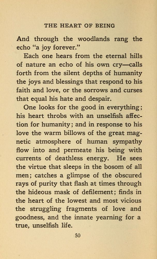 One looks for the good in everything; his heart throbs with an unselfish affection for humanity; and in response to his love the warm billows of the great magnetic atmosphere of human sympathy flow into and permeate his being with currents of deathless energy. He sees the virtue that sleeps in the bosom of all men; catches a glimpse of the obscured rays of purity that flash at times through the hideous mask of defilement; finds in the heart of the lowest and most vicious the struggling fragments of love and goodness, and the innate yearning for a true, unselfish life.