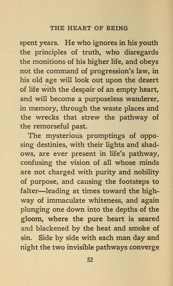 The mysterious promptings of opposing destinies, with their lights and shadows, are ever present in life's pathway, confusing the vision of all whose minds are not charged with purity and nobility of purpose, and causing the footsteps to falter --- leading at times toward the highway of immaculate whiteness, and again plunging one down into the depths of the gloom, where the pure heart is seared and blackened by the heat and smoke of sin. Side by side with each man day and night the two invisible pathways converge