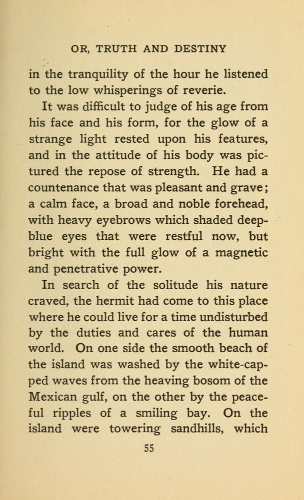 In search of the solitude his nature craved, the hermit had come to this place where he could live for a time undisturbed by the duties and cares of the human world. On one side the smooth beach of the island was washed by the white-capped waves from the heaving bosom of the Mexican gulf, on the other by the peaceful ripples of a smiling bay. On the island were towering sandhills, which