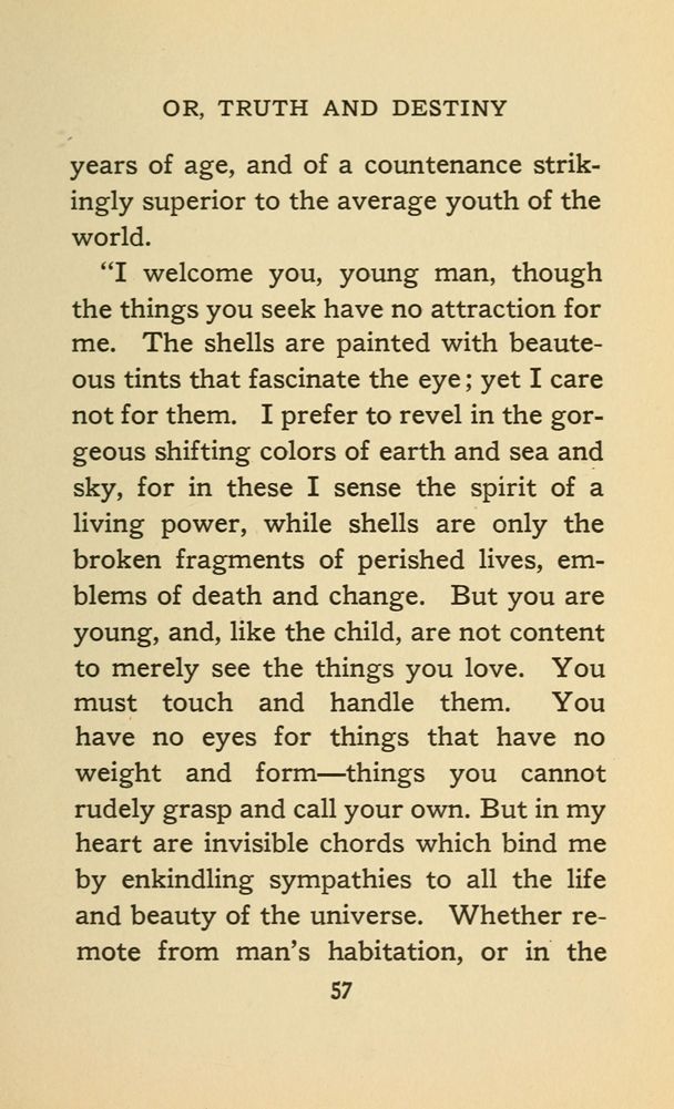 "I welcome you, young man, though the things you seek have no attraction for me. The shells are painted with beauteous tints that fascinate the eye; yet I care not for them. I prefer to revel in the gorgeous shifting colors of earth and sea and sky, for in these I sense the spirit of a living power, while shells are only the broken fragments of perished lives, emblems of death and change. But you are young, and, like the child, are not content to merely see the things you love. You must touch and handle them. You have no eyes for things that have no weight and form things you cannot rudely grasp and call your own. But in my heart are invisible chords which bind me by enkindling sympathies to all the life and beauty of the universe. Whether remote from man's habitation, or in the