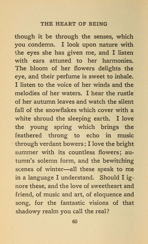 though it be through the senses, which you condemn. I look upon nature with the eyes she has given me, and I listen with ears attuned to her harmonies. The bloom of her flowers delights the eye, and their perfume is sweet to inhale. I listen to the voice of her winds and the melodies of her waters. I hear the rustle of her autumn leaves and watch the silent fall of the snowflakes which cover with a white shroud the sleeping earth. I love the young spring which brings the feathered throng to echo in music through verdant bowers; I love the bright summer with its countless flowers; autumn's solemn form, and the bewitching scenes of winter --- all these speak to me in a language I understand. Should I ignore these, and the love of sweetheart and friend, of music and art, of eloquence and song, for the fantastic visions of that shadowy realm you call the real?