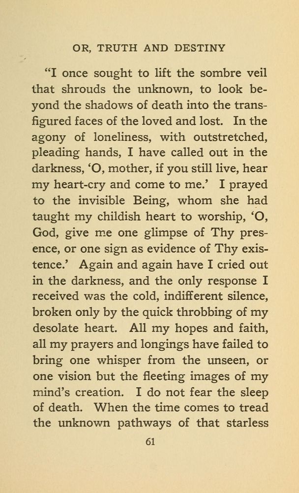 "I once sought to lift the sombre veil that shrouds the unknown, to look beyond the shadows of death into the transfigured faces of the loved and lost. In the agony of loneliness, with outstretched, pleading hands, I have called out in the darkness, '0, mother, if you still live, hear my heart-cry and come to me.' I prayed to the invisible Being, whom she had taught my childish heart to worship, '0, God, give me one glimpse of Thy presence, or one sign as evidence of Thy existence.' Again and again have I cried out in the darkness, and the only response I received was the cold, indifferent silence, broken only by the quick throbbing of my desolate heart. All my hopes and faith, all my prayers and longings have failed to bring one whisper from the unseen, or one vision but the fleeting images of my mind's creation. I do not fear the sleep of death. When the time comes to tread the unknown pathways of that starless