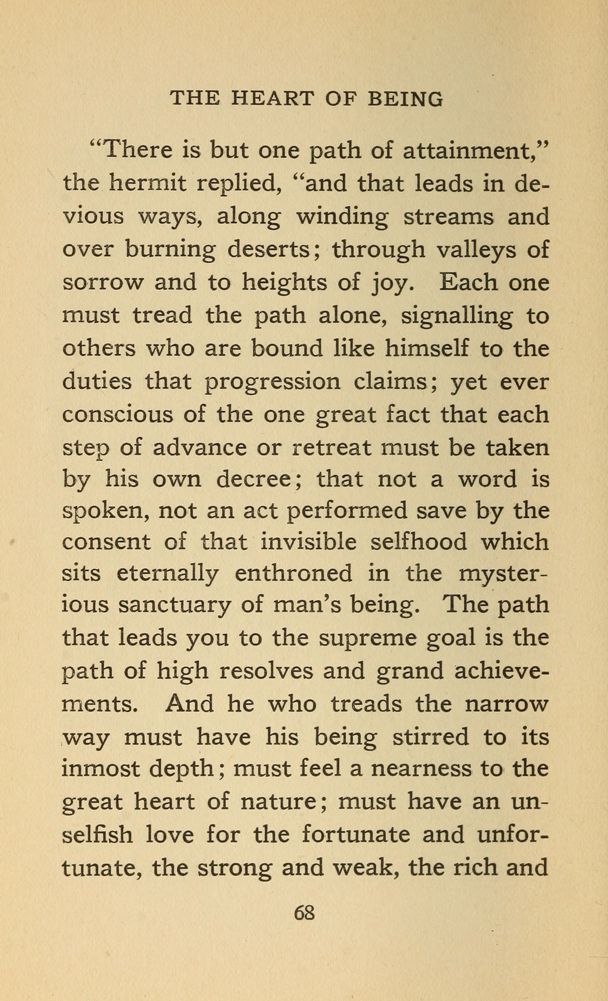 "There is but one path of attainment," the hermit replied, "and that leads in devious ways, along winding streams and over burning deserts; through valleys of sorrow and to heights of joy. Each one must tread the path alone, signalling to others who are bound like himself to the duties that progression claims; yet ever conscious of the one great fact that each step of advance or retreat must be taken by his own decree; that not a word is spoken, not an act performed save by the consent of that invisible selfhood which sits eternally enthroned in the mysterious sanctuary of man's being. The path that leads you to the supreme goal is the path of high resolves and grand achievements. And he who treads the narrow way must have his being stirred to its inmost depth; must feel a nearness to the great heart of nature; must have an unselfish love for the fortunate and unfortunate, the strong and weak, the rich and
