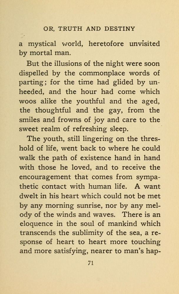 The youth, still lingering on the threshold of life, went back to where he could walk the path of existence hand in hand with those he loved, and to receive the encouragement that comes from sympathetic contact with human life. A want dwelt in his heart which could not be met by any morning sunrise, nor by any melody of the winds and waves. There is an eloquence in the soul of mankind which transcends the sublimity of the sea, a response of heart to heart more touching and more satisfying, nearer to man's happiness
