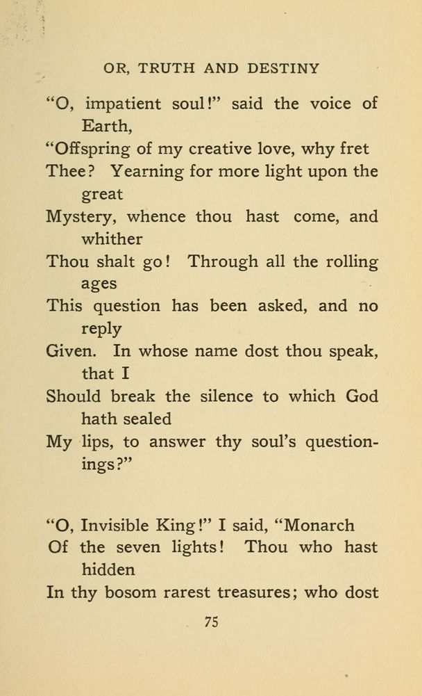 The Primary Processes of World Building - Man's Progress - The Manifestation of Love - Seeking The Invisible Presence - The Wordless Voice - The Creative Impulse - The Realm of Self-Consciousness - The Echo From The Eternal Hills - The Hermit And The Youth - The Wanderings of The Soul - The Destined Goal