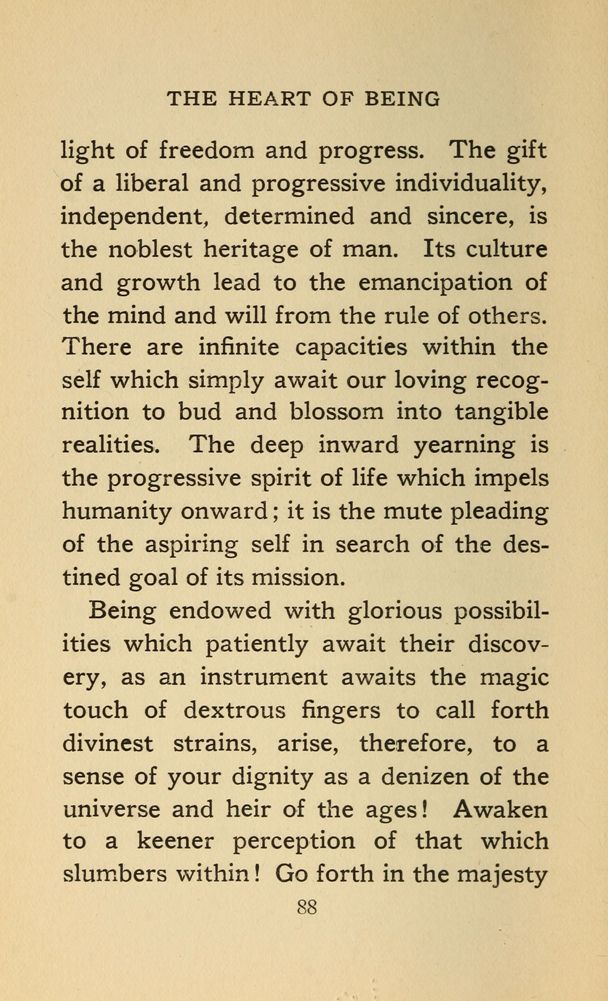 of freedom and progress. The gift of a liberal and progressive individuality, independent, determined and sincere, is the noblest heritage of man. Its culture and growth lead to the emancipation of the mind and will from the rule of others. There are infinite capacities within the self which simply await our loving recognition to bud and blossom into tangible realities. The deep inward yearning is the progressive spirit of life which impels humanity onward; it is the mute pleading of the aspiring self in search of the destined goal of its mission.