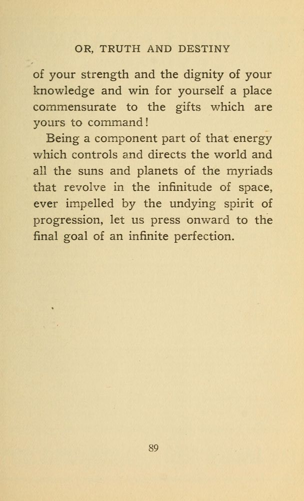 Being a component part of that energy which controls and directs the world and all the suns and planets of the myriads that revolve in the infinitude of space, ever impelled by the undying spirit of progression, let us press onward to the final goal of an infinite perfection.