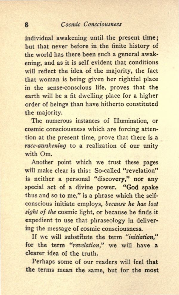 Another point which we trust these pages will make clear is this: So-called "revelation" is neither a personal "discovery," nor any special act of a divine power. "God spake thus and so to me," is a phrase which the self-conscious initiate employs, because he has lost sight of the cosmic light, or because he finds it expedient to use that phraseology in delivering the message of cosmic consciousness.