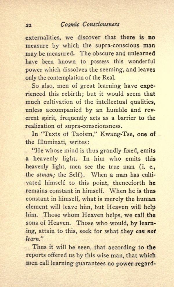 So also, men of great learning have experienced this rebirth; but it would seem that much cultivation of the intellectual qualities, unless accompanied by an humble and reverent spirit, frequently acts as a barrier to the realization of supra-consciousness.