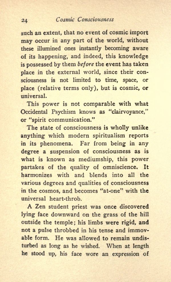 such an extent, that no event of cosmic import may occur in any part of the world, without these illumined ones instantly becoming aware of its happening, and indeed, this knowledge is possessed by them before the event has taken place in the external world, since their consciousness is not limited to time, space, or place (relative terms only), but is cosmic, or universal.