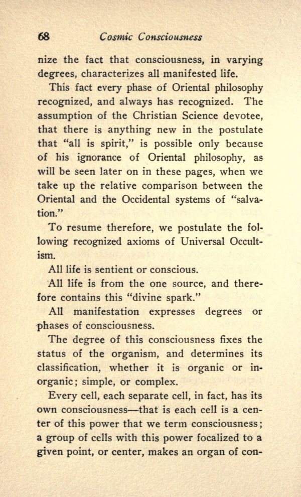 Every cell, each separate cell, in fact, has its own consciousness--that is each cell is a center of this power that we term consciousness; a group of cells with this power focalized to a given point, or center, makes an organ of consciousness,