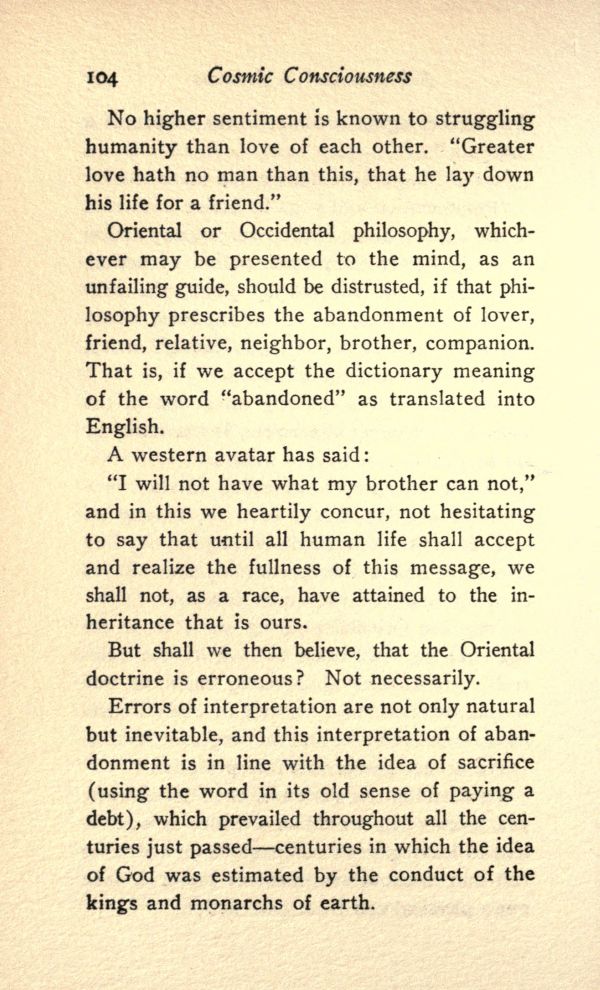 Oriental or Occidental philosophy, whichever may be presented to the mind, as an unfailing guide, should be distrusted, if that philosophy prescribes the abandonment of lover, friend, relative, neighbor, brother, companion. That is, if we accept the dictionary meaning of the word "abandoned" as translated into English.