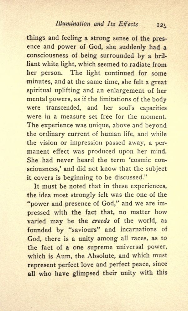 things and feeling a strong sense of the presence and power of God, she suddenly had a consciousness of being surrounded by a brilliant white light, which seemed to radiate from her person. The light continued for some minutes, and at the same time, she felt a great spiritual uplifting and an enlargement of her mental powers, as if the limitations of the body were transcended, and her soul's capacities were in a measure set free for the moment. The experience was unique, above and beyond the ordinary current of human life, and while the vision or impression passed away, a permanent effect was produced upon her mind. She had never heard the term 'cosmic consciousness,' and did not know that the subject it covers is beginning to be discussed."
