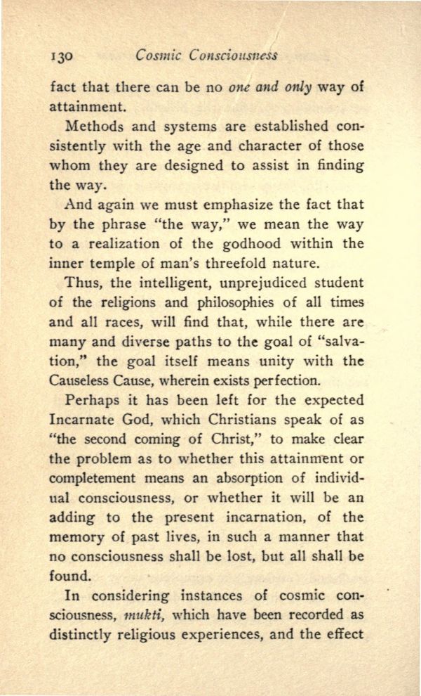 Perhaps it has been left for the expected Incarnate God, which Christians speak of as "the second coming of Christ," to make clear the problem as to whether this attainment or completement means an absorption of individual consciousness, or whether it will be an adding to the present incarnation, of the memory of past lives, in such a manner that no consciousness shall be lost, but all shall be found.
