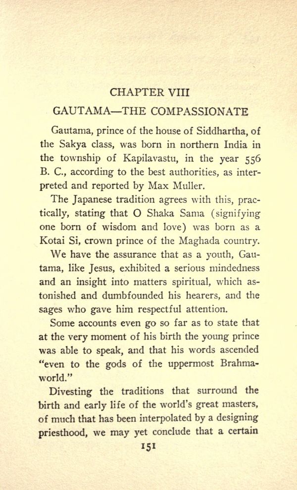 Gautama, prince of the house of Siddhartha, of the Sakya class, was born in northern India in the township of Kapilavastu, in the year 556 B.C., according to the best authorities, as interpreted and reported by Max Muller.