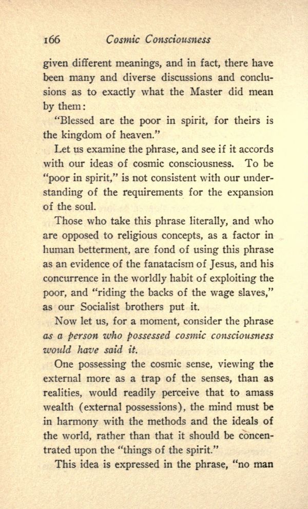 Let us examine the phrase, and see if it accords with our ideas of cosmic consciousness. To be "poor in spirit," is not consistent with our understanding of the requirements for the expansion of the soul.