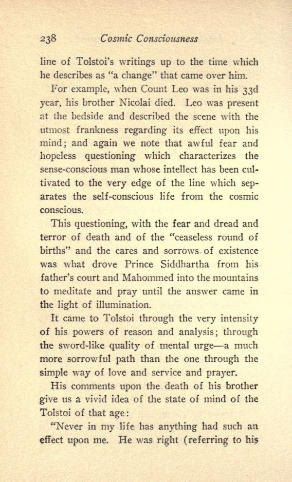 For example, when Count Leo was in his 33d year, his brother Nicolai died. Leo was present at the bedside and described the scene with the utmost frankness regarding its effect upon his mind; and again we note that awful fear and hopeless questioning which characterizes the sense-conscious man whose intellect has been cultivated to the very edge of the line which separates the self-conscious life from the cosmic conscious.