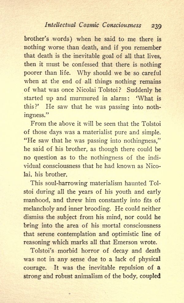From the above it will be seen that the Tolstoi of those days was a materialist pure and simple. "He saw that he was passing into nothingness," he said of his brother, as though there could be no question as to the nothingness of the individual consciousness that he had known as Nicolai, his brother.