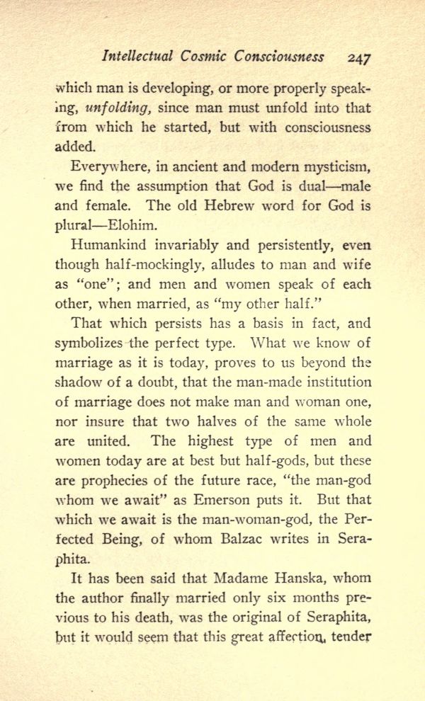 That which persists has a basis in fact, and symbolizes the perfect type. What we know of marriage as it is to-day, proves to us beyond the shadow of a doubt, that the man-made institution of marriage does not make man and woman one, nor insure that two halves of the same whole are united. The highest type of men and women to-day are at best but half-gods, but these are prophecies of the future race, "the man-god whom we await" as Emerson puts it. But that which we await is the man-woman-god, the Perfected Being, of whom Balzac writes in Seraphita.