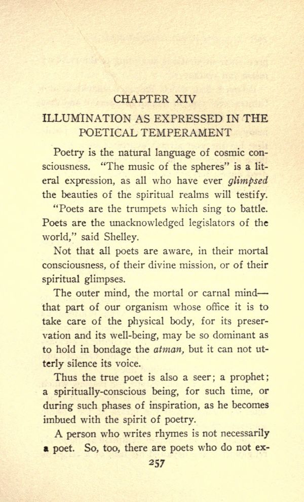 Poetry is the natural language of cosmic consciousness. "The music of the spheres" is a literal expression, as all who have ever glimpsed the beauties of the spiritual realms will testify.