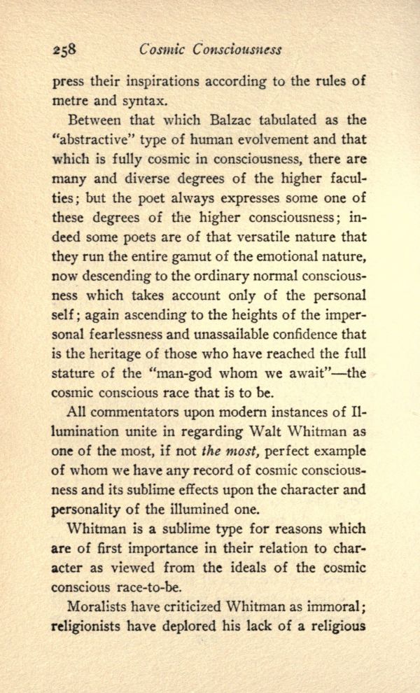 Whitman is a sublime type for reasons which are of first importance in their relation to character as viewed from the ideals of the cosmic conscious race-to-be.