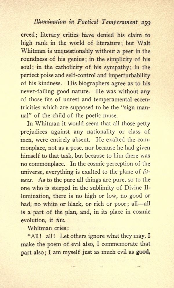 In Whitman it would seem that all those petty prejudices against any nationality or class of men, were entirely absent. He exalted the common-place, not as a pose, nor because he had given himself to that task, but because to him there was no common-place. In the cosmic perception of the universe, everything is exalted to the plane of fitness. As to the pure all things are pure, so to the one who is steeped in the sublimity of Divine Illumination, there is no high or low, no good or bad, no white or black, or rich or poor; all--all is a part of the plan, and, in its place in cosmic evolution, it fits.