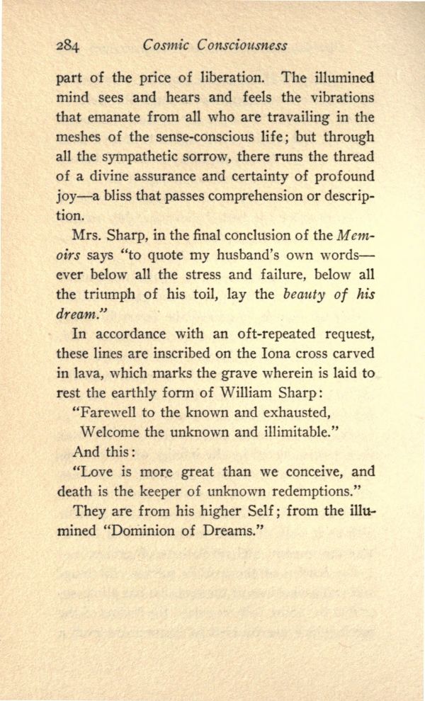 In accordance with an oft-repeated request, these lines are inscribed on the Iona cross carved in lava, which marks the grave wherein is laid to rest the earthly form of William Sharp: