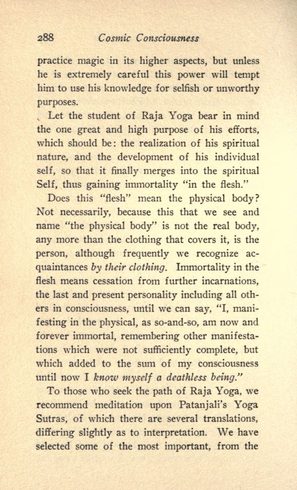 Let the student of Raja Yoga bear in mind the one great and high purpose of his efforts, which should be: the realization of his spiritual nature, and the development of his individual self, so that it finally merges into the spiritual Self, thus gaining immortality "in the flesh."