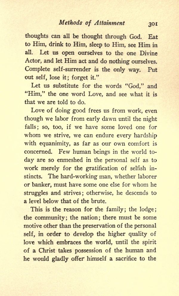 Love of doing good frees us from work, even though we labor from early dawn until the night falls; so, too, if we have some loved one for whom we strive, we can endure every hardship with equanimity, as far as our own comfort is concerned. Few human beings in the world to-day are so enmeshed in the personal self as to work merely for the gratification of selfish instincts. The hard-working man, whether laborer or banker, must have some one else for whom he struggles and strives; otherwise, he descends to a level below that of the brute.