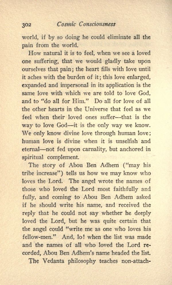 How natural it is to feel, when we see a loved one suffering, that we would gladly take upon ourselves that pain; the heart fills with love until it aches with the burden of it; this love enlarged, expanded and impersonal in its application is the same love with which we are told to love God, and to "do all for Him." Do all for love of all the other hearts in the Universe that feel as we feel when their loved ones suffer--that is the way to love God--it is the only way we know. We only know divine love through human love: human love is divine when it is unselfish and eternal--not fed upon carnality, but anchored in spiritual complement.