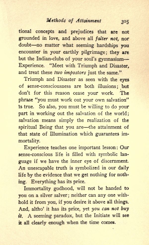 Immortality godhood, will not be handed to you on a silver salver; neither can any one withhold it from you, if you desire it above all things. And, altho' it has its price, yet you can not buy it. A seeming paradox, but the Initiate will see it all clearly enough when the time comes.