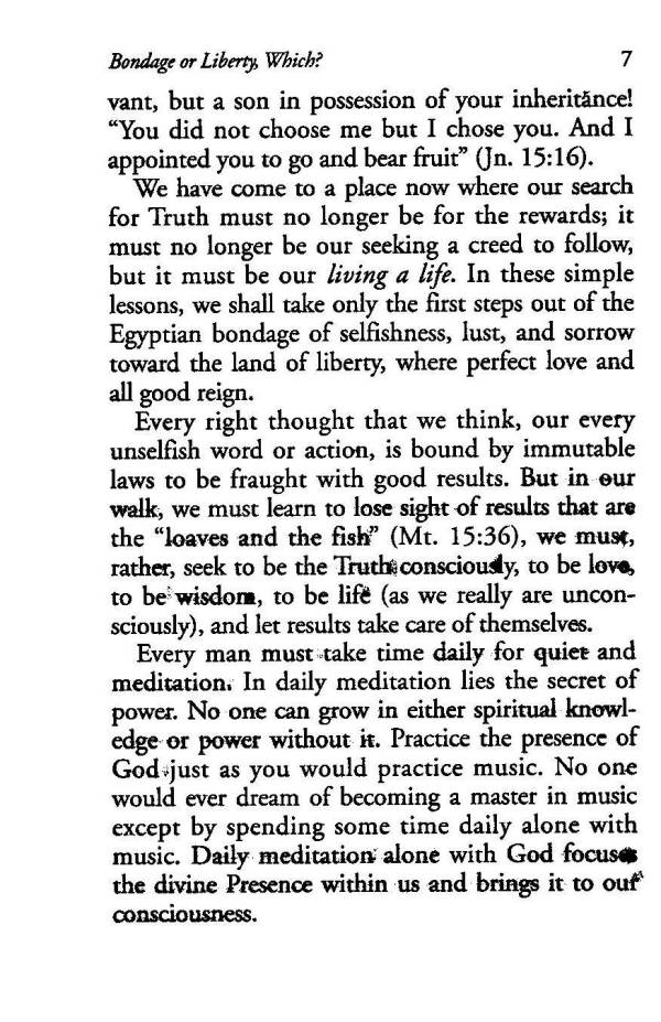We have come to a place now where our search for Truth must no longer be for the rewards; it must no longer be our seeking a creed to follow, but it must be our living a life. In these simple lessons, we shall take only the first steps out of the Egyptian bondage of selfishness, lust, and sorrow toward the land of liberty, where perfect love and all good reign.