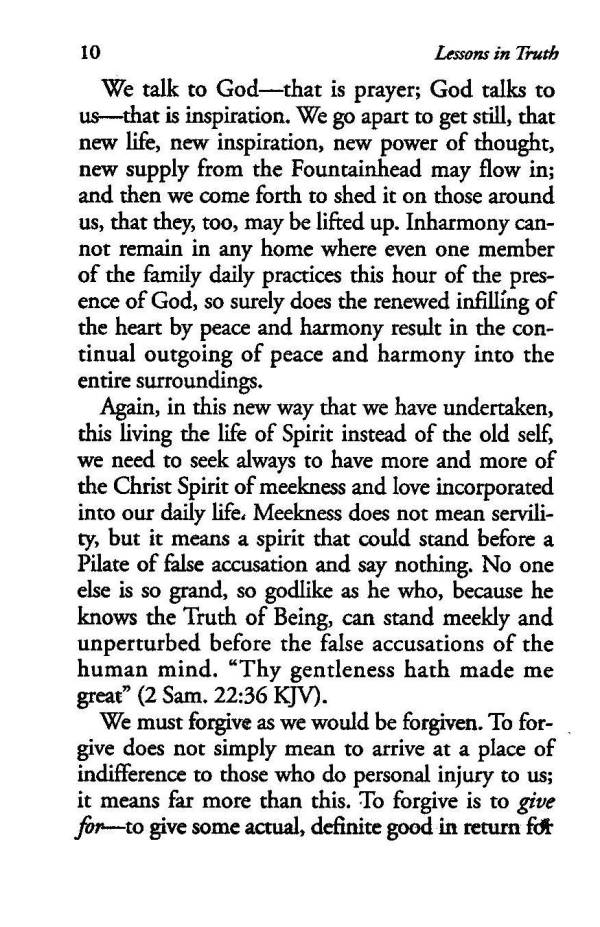 Again, in this new way that we have undertaken, this living the life of Spirit instead of the old self; we need to seek always to have more and more of the Christ Spirit of meekness and love incorporated into our daily life, Meekness does not mean servility, but it means a spirit that could stand before a Pilate of false accusation and say nothing. No one else is so grand, so godlike as he who, because he knows the Truth of Being, can stand meekly and unperturbed before the false accusations of the human mind. "Thy gentleness hath made me great" (2 Sam. 22:36 KJV).
