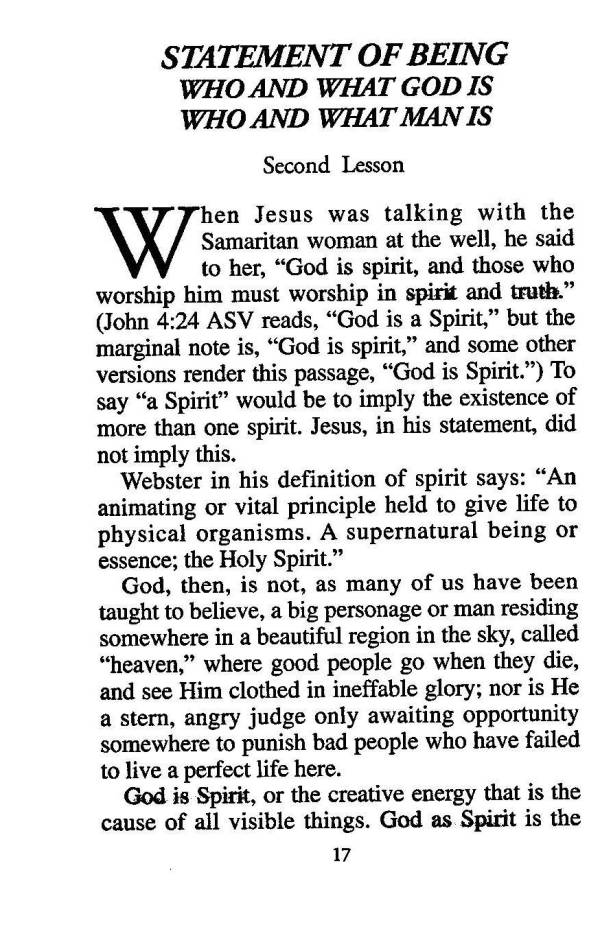 God, then, is not, as many of us have been taught to believe, a big personage or man residing somewhere in a beautiful region in the sky, called "heaven," where good people go when they die, and see Him clothed in ineffable glory; nor is He a stern, angry judge only awaiting opportunity somewhere to punish bad people who have failed to live a perfect life here.