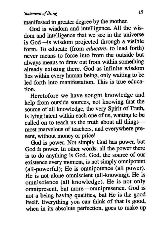 God is wisdom and intelligence. All the wisdom and intelligence that we see in the universe is God --- is wisdom projected through a visible form. To educate (from educare, to lead forth) never means to force into from the outside but always means to draw out from within something already existing there. God as infinite wisdom lies within every human being, only waiting to be led forth into manifestation. This is true education.