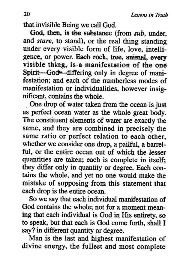 God, then, is the substance (from sub, under, and stare, to stand), or the real thing standing under every visible form of life, love, intelligence, or power. Each rock, tree, animal, every visible thing, is a manifestation of the one Spirit --- God --- differing only in degree of manifestation; and each of the numberless modes of manifestation or individualities, however insignificant, contains the whole.