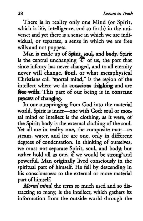 Man is made up of Spirit, soul, and body. Spirit is the central unchanging "I" of us, the part that since infancy has never changed, and to all eternity never will change. soul, or what metaphysical Christians call "mortal mind," is the region of the intellect where we do conscious thinking and are free wills. This part of our being is in constant process of changing.
