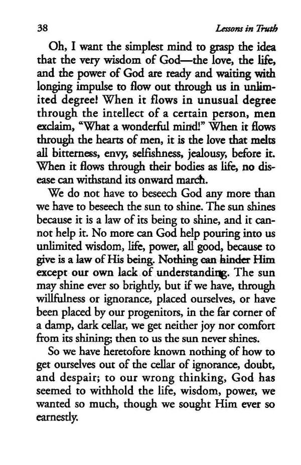 We do not have to beseech God any more than we have to beseech the sun to shine. The sun shines because it is a law of its being to shine, and it cannot help it. No more can God help pouring into us unlimited wisdom, life, power, all good, because to give is a law of His being. Nothing can hinder Him except our own lack of understanding. The sun may shine ever so brightly, but if we have, through willfulness or ignorance, placed ourselves, or have been placed by our progenitors, in the far corner of a damp, dark cellar, we get neither joy nor comfort from its shining; then to us the sun never shines.