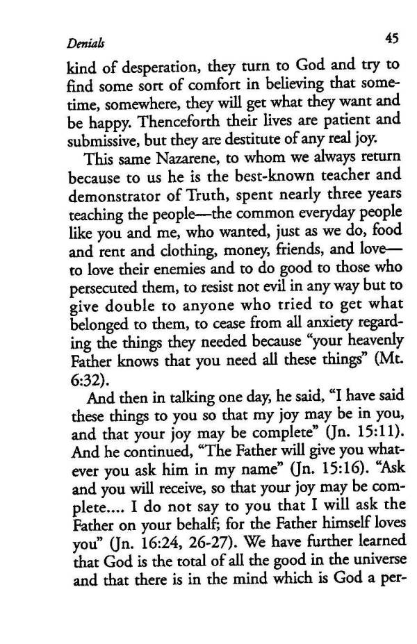 This same Nazarene, to whom we always return because to us he is the best-known teacher and demonstrator of Truth, spent nearly three years teaching the people --- the common everyday people like you and me, who wanted, just as we do, food and rent and clothing, money, friends, and love --- to love their enemies and to do good to those who persecuted them, to resist not evil in any way but to give double to anyone who tried to get what belonged to them, to cease from all anxiety regarding the things they needed because "your heavenly Father knows that you need all these things" (Mt. 6:32).