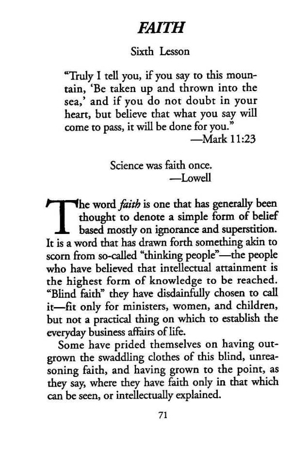 The word faith is one that has generally been thought to denote a simple form of belief based mostly on ignorance and superstition. It is a word that has drawn forth something akin to scorn from so-called "thinking people" --- the people who have believed that intellectual attainment is the highest form of knowledge to be reached. "Blind faith" they have disdainfully chosen to call it --- fit only for ministers, women, and children, but not a practical thing on which to establish the everyday business affairs of life.