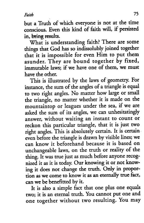 This is illustrated by the laws of geometry. For instance, the sum of the angles of a triangle is equal to two right angles. No matter how large or small the triangle, no matter whether it is made on the mountaintop or leagues under the sea, if we are asked the sum of its angles, we can unhesitatingly answer, without waiting an instant to count or reckon this particular triangle, that it is just two right angles. This is absolutely certain. It is certain even before the triangle is drawn by visible lines; we can know it beforehand because it is based on unchangeable laws, on the truth or reality of the thing. It was true just as much before anyone recognized it as it is today. Our knowing it or not knowing it does not change the truth. Only in proportion as we come to know it as an eternally true fact, can we be benefitted by it.