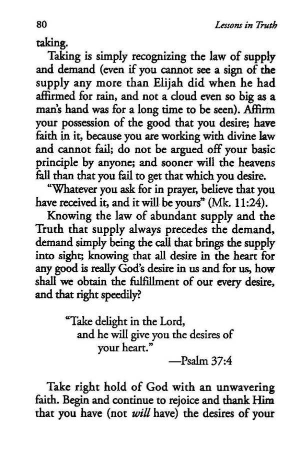 Taking is simply recognizing the law of supply and demand (even if you cannot see a sign of the supply any more than Elijah did when he had affirmed for rain, and not a cloud even so big as a man's hand was for a long time to be seen). Affirm your possession of the good that you desire; have faith in it, because you are working with divine law and cannot fail; do not be argued off your basic principle by anyone; and sooner will the heavens fall than that you fail to get that which you desire.