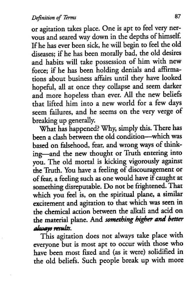 or agitation takes place. One is apt to feel very nervous and seared way down in the depths of himself. If he has ever been sick, he will begin to feel the old diseases; if he has been morally bad, the old desires and habits will take possession of him with new force; if he has been holding denials and affirmations about business affairs until they have looked hopeful, all at once they collapse and seem darker and more hopeless than ever. All the new beliefs that lifted him into a new world for a few days seem failures, and he seems on the very verge of breaking up generally.