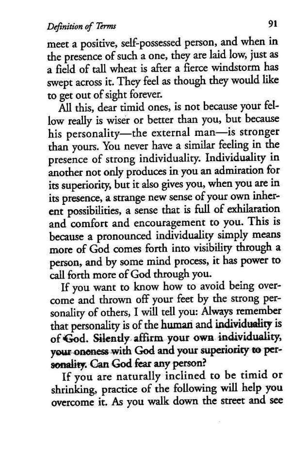All this, dear timid ones, is not because your fellow really is wiser or better than you, but because his personality --- the external man --- is stronger than yours. You never have a similar feeling in the presence of strong individuality. Individuality in another not only produces in you an admiration for its superiority, but it also gives you, when you are in its presence, a strange new sense of your own inherent possibilities, a sense that is full of exhilaration and comfort and encouragement to you. This is because a pronounced individuality simply means more of God comes forth into visibility through a person, and by some mind process, it has power to call forth more of God through you.