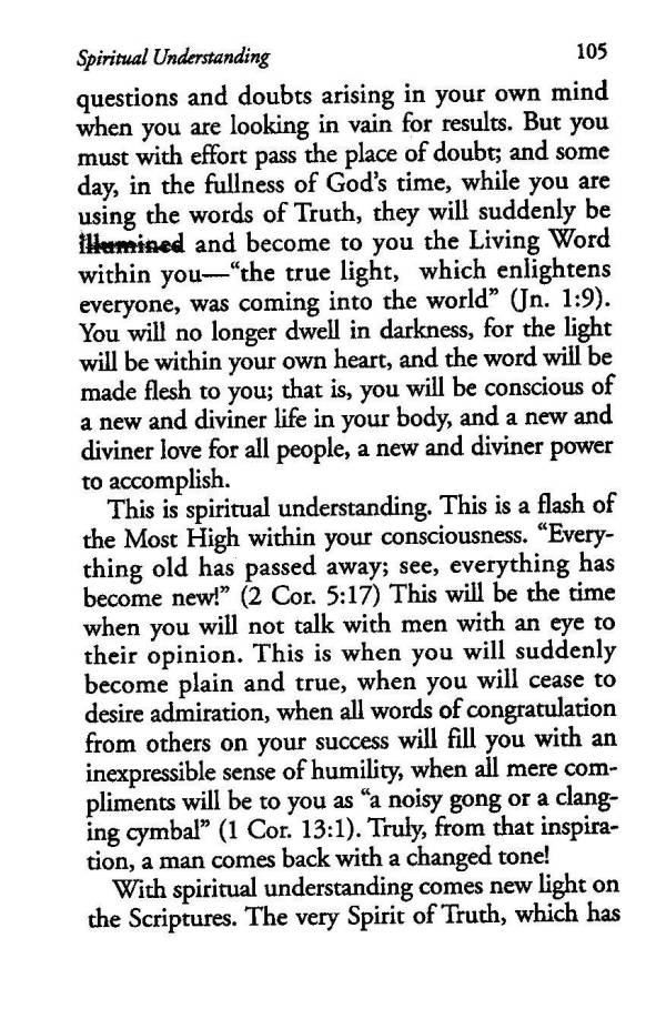 questions and doubts arising in your own mind when you are looking in vain for results. But you must with effort pass the place of doubt; and some day, in the fullness of God's time, while you are using the words of Truth, they will suddenly be illumined and become to you the Living Word within you --- "the true light, which enlightens everyone, was coming into the world" (Jn. 1:9). You will no longer dwell in darkness, for the light will be within your own heart, and the word will be made flesh to you; that is, you will be conscious of a new and diviner life in your body, and a new and diviner love for all people, a new and diviner power to accomplish.