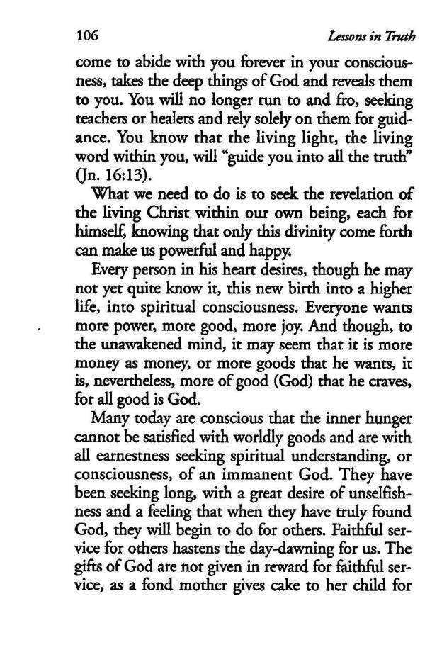 Every person in his heart desires, though he may not yet quite know it, this new birth into a higher life, into spiritual consciousness. Everyone wants more power, more good, more joy. And though, to the unawakened mind, it may seem that it is more money as money, or more goods that he wants, it is, nevertheless, more of good (God) that he craves, for all good is God.