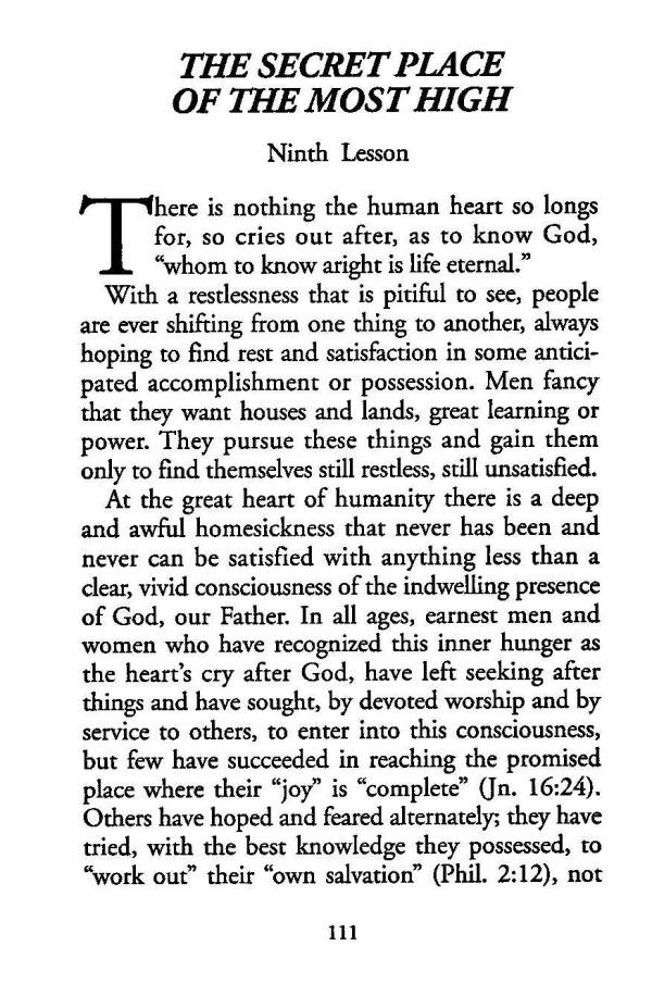At the great heart of humanity there is a deep and awful homesickness that never has been and never can be satisfied with anything less than a clear, vivid consciousness of the indwelling presence of God, our Father. In all ages, earnest men and women who have recognized this inner hunger as the heart's cry after God, have left seeking after things and have sought, by devoted worship and by service to others, to enter into this consciousness, but few have succeeded in reaching the promised place where their "joy" is "complete" (Jn. 16:24).