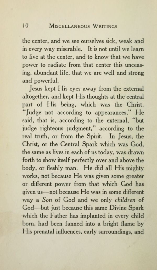 Jesus kept His eyes away from the external altogether, and kept His thoughts at the central part of His being, which was the Christ. "Judge not according to appearances," He said, that is, according to the external, "but judge righteous judgment," according to the real truth, or from the Spirit. In Jesus, the Christ, or the Central Spark which was God, the same as lives in each of us today, was drawn forth to show itself perfectly over and above the body, or fleshly man. He did all His mighty works, not because He was given some greater or different power from that which God has given us --- not because He was in some different way a Son of God and we only children of God --- but just because this same Divine Spark which the Father has implanted in every child born, had been fanned into a bright flame by His prenatal influences, early surroundings, and
